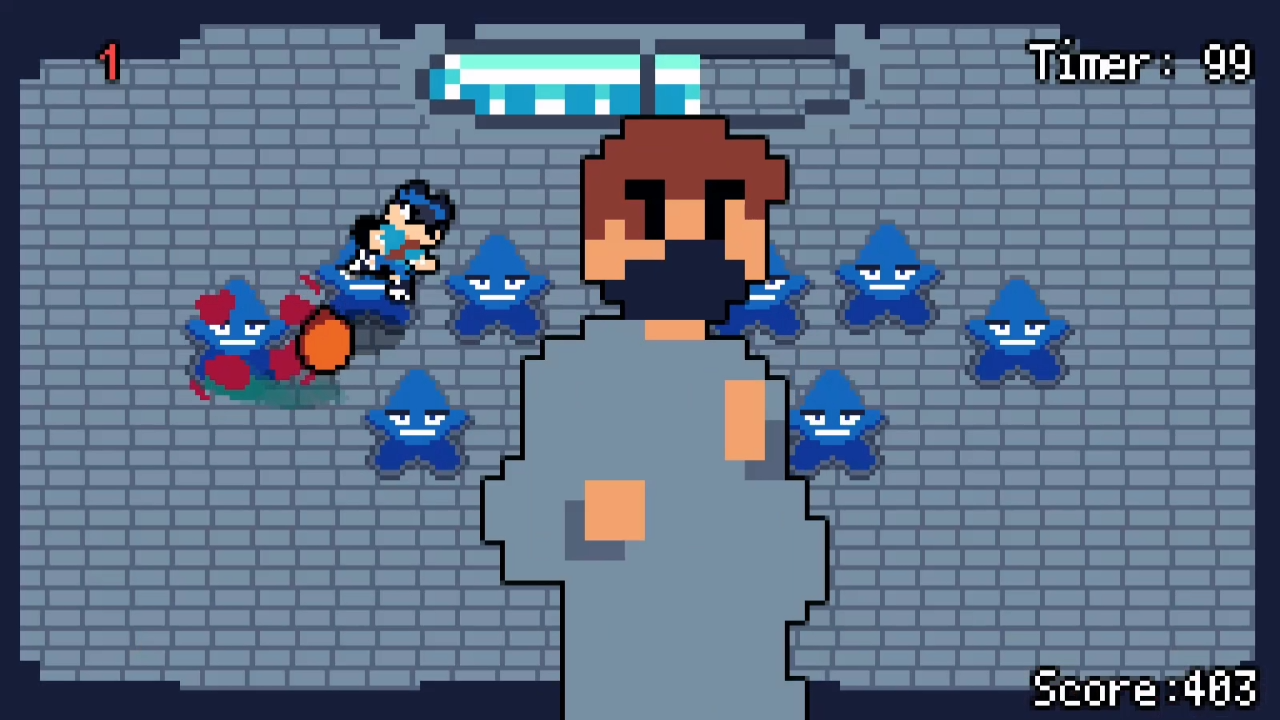 You wake up in a small, enclosed room. You have your sword, dash, kicks, and dynamite. After the text "Make The Fiesta" appears, the party begins, and a bunch of monsters are chasing you to kill you.